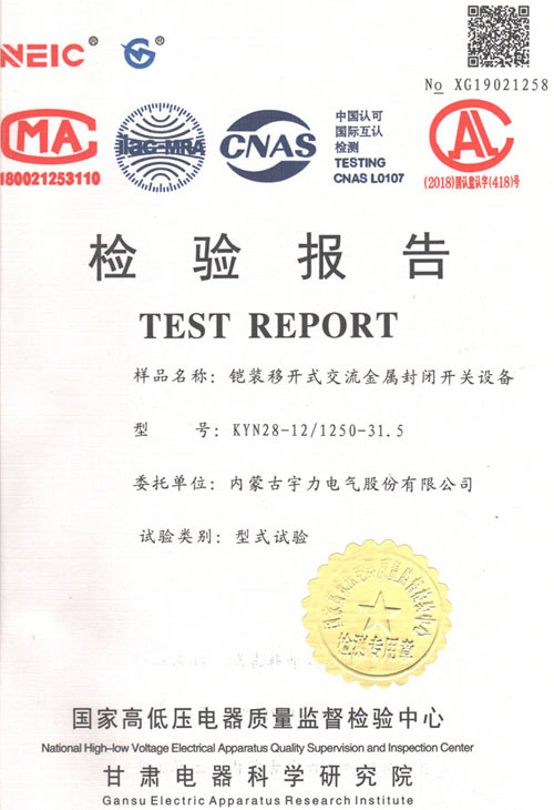 KYN28-12/1250-31.5中置式開關(guān)柜(檢驗報告)