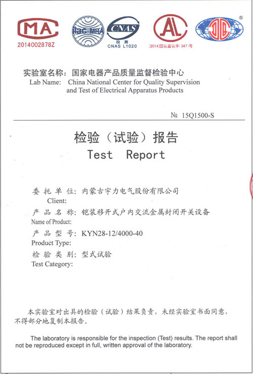 KYN28-12/4000-40中置式開關(guān)柜(檢驗報告)
