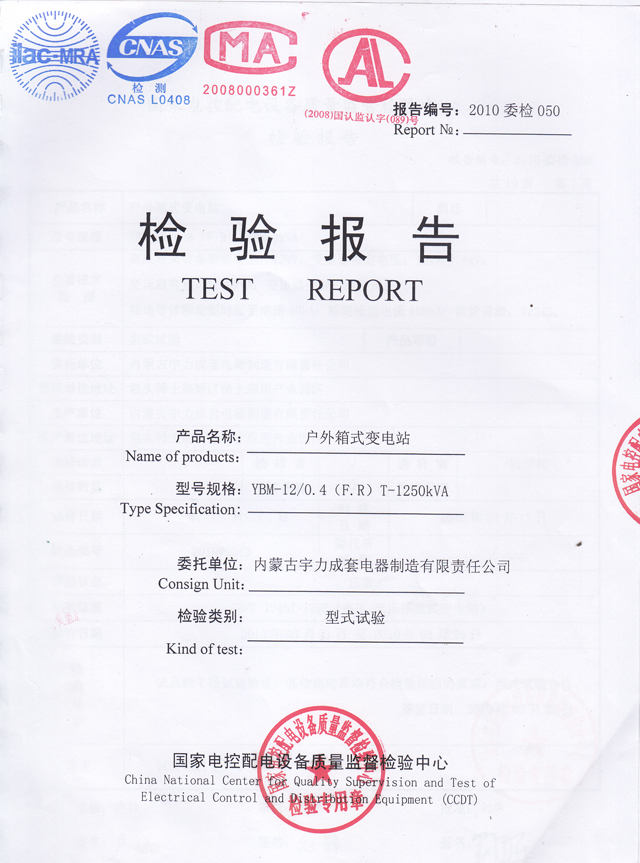 YBM-12/0.4戶外箱式變電站(檢驗報告)
