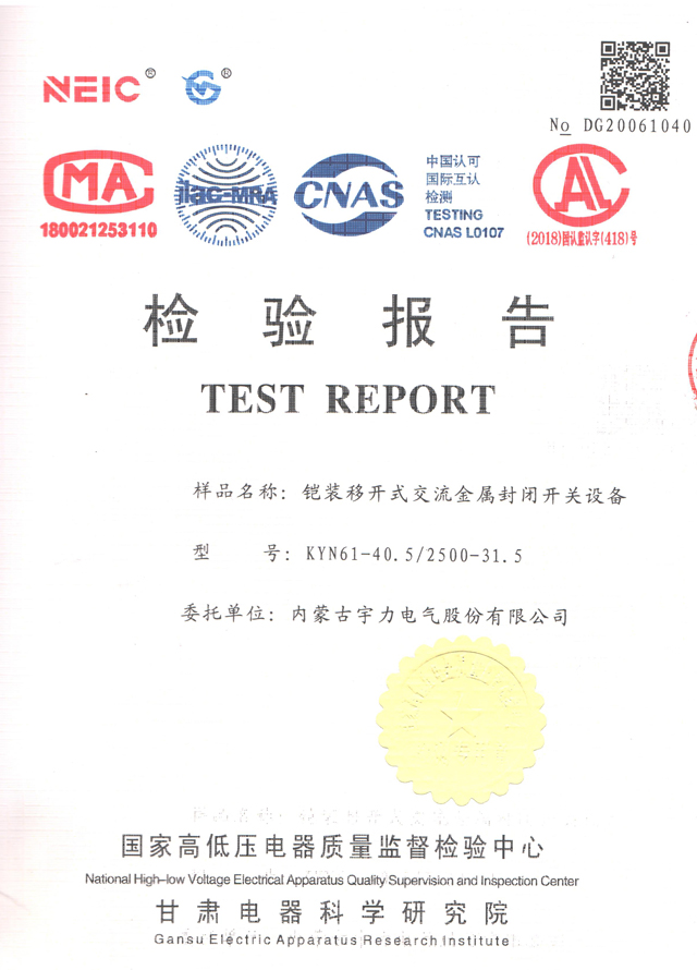 KYN61-40.5/2500-31.5鎧裝式開關(guān)柜(檢驗報告)